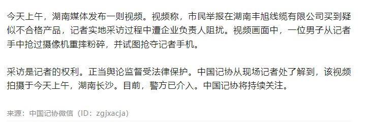 7月15日,湖南一电视台记者收到市民线索报料称买到不合格电缆,在前往湖南丰旭线缆有限公司采访时,遭到企业负责人阻挠,有采访设备被砸坏。