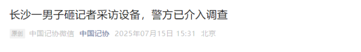 15日下午,中国记协就该事件发声:“采访是记者的权利。正当舆论监督受法律保护。中国记协从现场记者处了解到,该视频拍摄于今天上午,湖南长沙。目前,警方已介入。中国记协将持续关注。”
